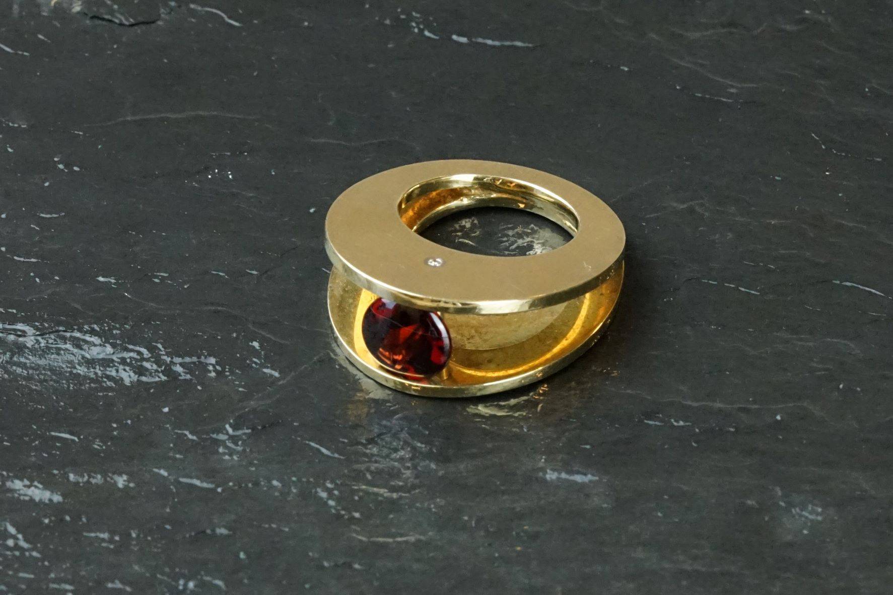 Gelbgold 585/000 Ring mit Granat (1) und Brillanten (2). Ringgröße 52